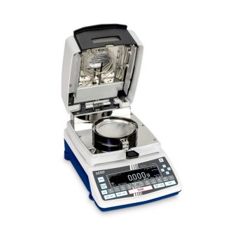 Fuktanalysator KERN DIS kombinerer høy oppløsning med enkel og intuitiv bruk. Vekten har en grafisk LCD-skjerm med bakgrunnsbelysning som viser tørkekurver i sanntid og tidligere målinger, slik at analysen er lett å følge. Med tre-trinns betjening (tara – tilsett prøve – start) blir arbeidet raskt, reproduserbart og brukervennlig. Den innebygde halogen-kvartsvarmeren på 400 W sikrer jevn og kontrollert tørking, og internminnet kan lagre opptil 1000 måleresultater. Innstillinger og data beskyttes med passord, og det er mulig å programmere prøvebeskrivelser for opptil 1000 prøver.
