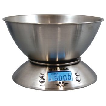 MyWeigh Steele er den perfekte vekt til ditt kjøkken, den store flyttbare skålen er perfekt til veiing av ingredienser. Vekten har tara funksjon. Den er i rustfritt stål og skålen kan maskinvaskes. MyWeigh Steele er ikke bare en vekt, det er også en timer og et termometer, noe som er nyttig for enhver baker som ønsker å sikre seg at rommet har den korrekte temperaturen for hans/hennes wienerbrød. Den store bakgrunnsopplyste LCD-skjermen viser vekt i to tilstander (g / kg, oz / LB)